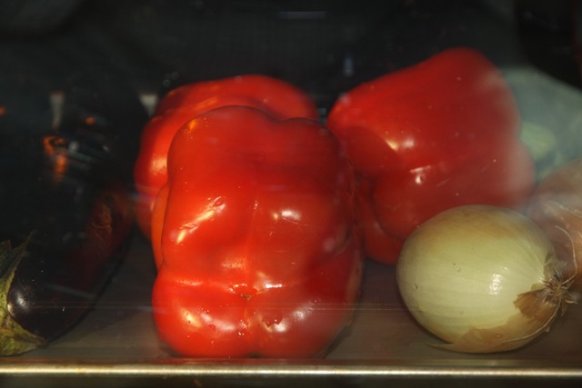 Выложить на противень помытые баклажаны, красный перец, лук и помидоры; чистить от кожицы и шелухи не надо. Держать в духовке в течение 30-40 минут, пока овощи не станут мягкими и не запекутся.